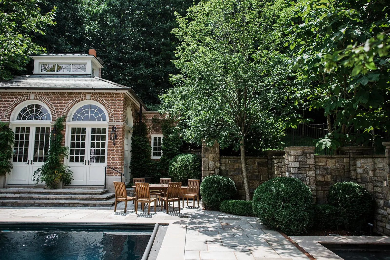 A shade garden under a stately oak holds hellebore, lysimachia, aucuba and epimedium. The pool area features elegant, classic landscaping with towering boxwoods, an espalier pear and New Dawn climbing roses. “The pool area has some of the most beautiful old-growth climbing hydrangeas on the pool house, and the fountain surrounded by boxwoods is especially peaceful,” Barrett says.