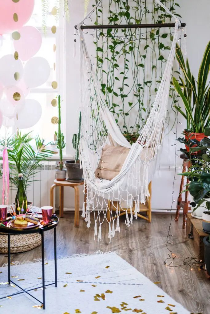 Don’t limit your indoor plants to the floor or tabletops. Utilize all available spaces including walls, ceilings, and stairs. Hanging macrame plant holders can help you with placement by windows when a plant needs more light. Plants that grow in an upward vining nature can be trained up furniture and across walls.