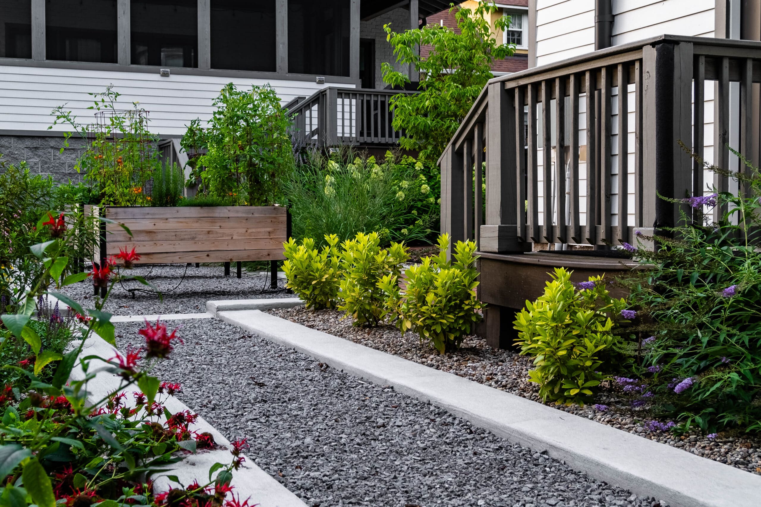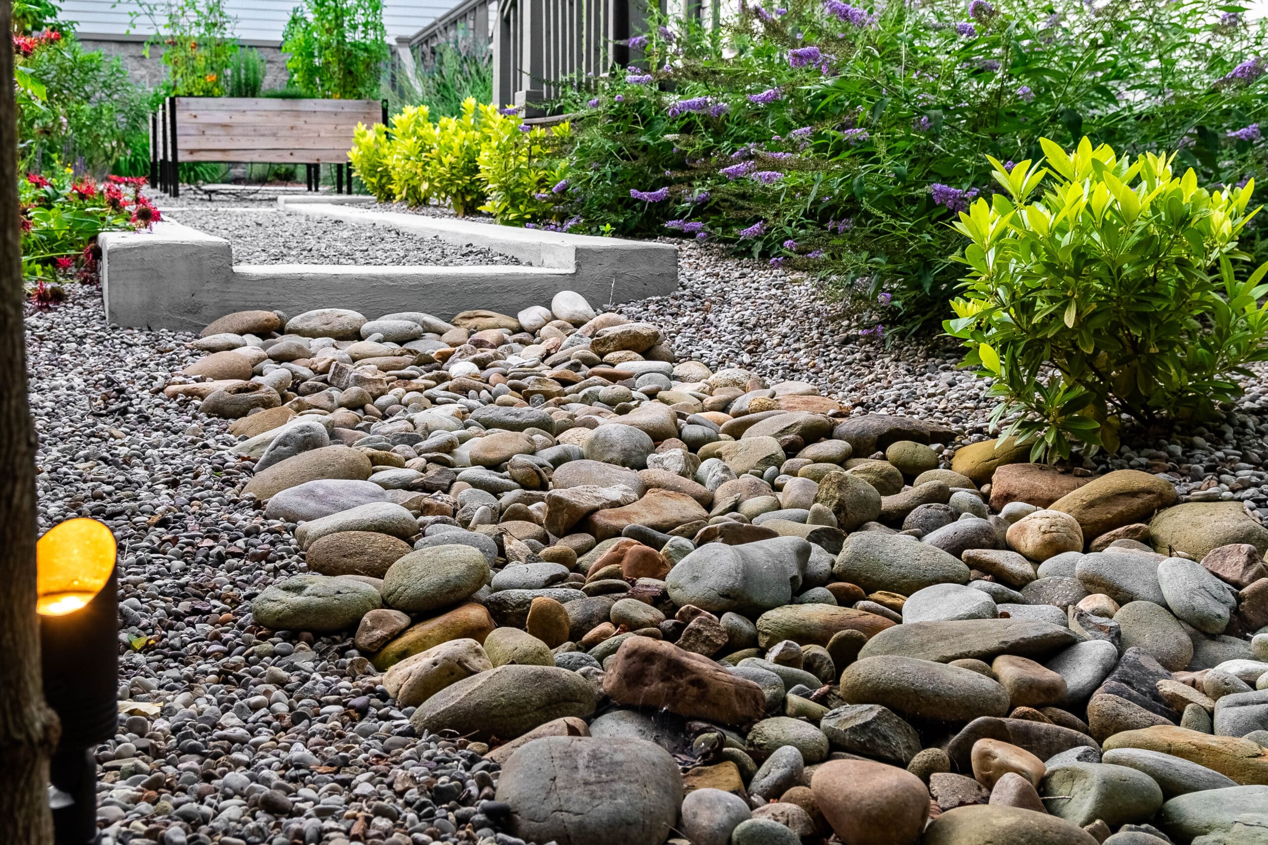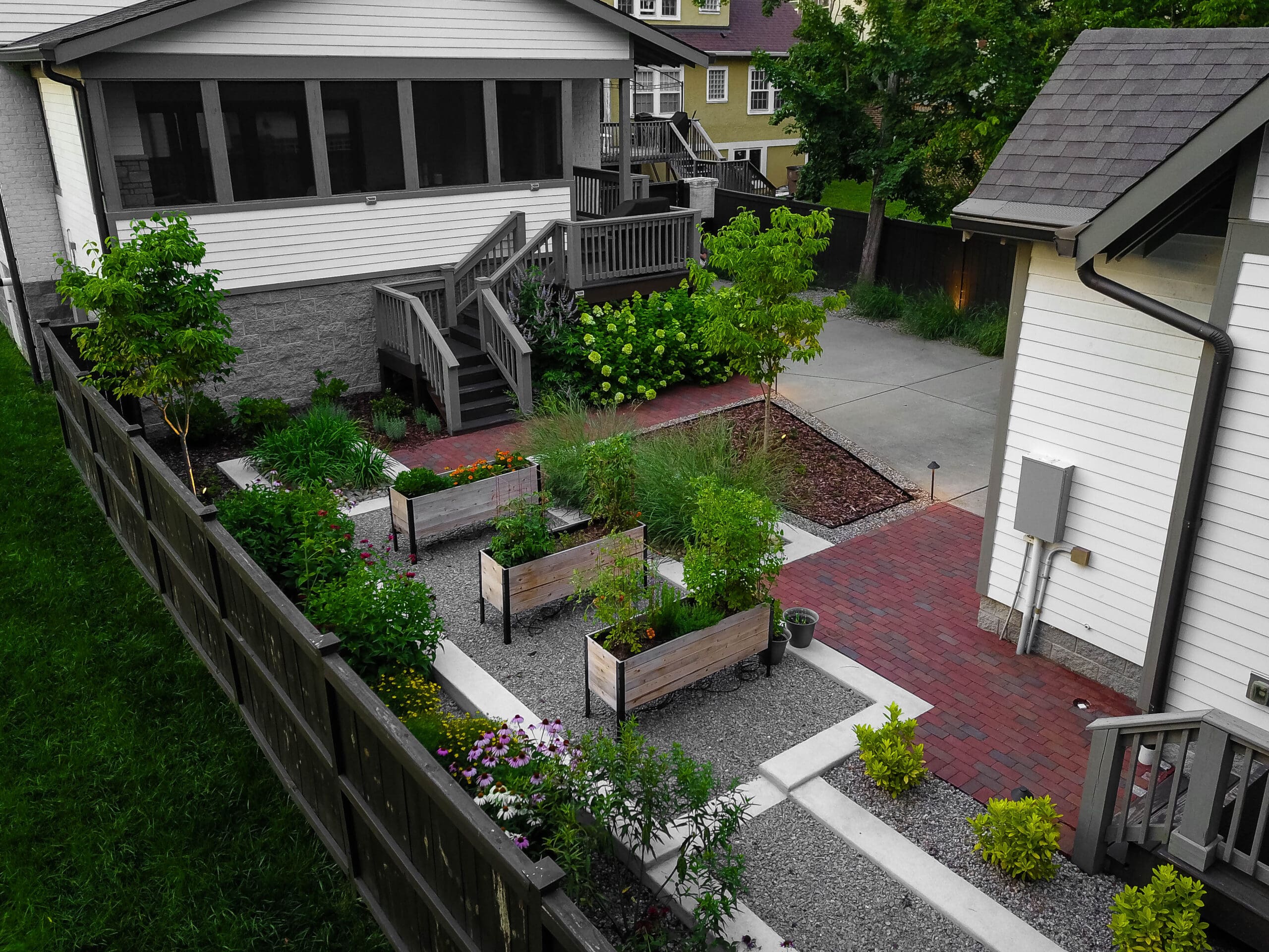 A steep slope caused stormwater to flood the backyard, making the space unusable. The homeowners also wanted raised beds, native plantings, and seasonal color to make the yard both functional and inviting.