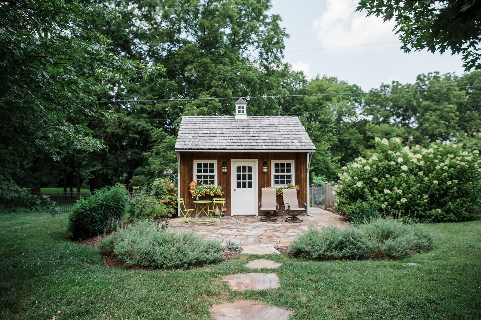 “We’ve worked around that shed from the start,” Barrett says. While the shed holds gardening tools and equipment, the brown siding and crisp white trim assure that it looks more like a cottage. Window boxes are filled with colorful blooms in summer, a cupola on the roof complements the door, and the shed is surrounded by lush hydrangeas and other shrubbery. From the patio, the shed and its surroundings act as the natural focal point.