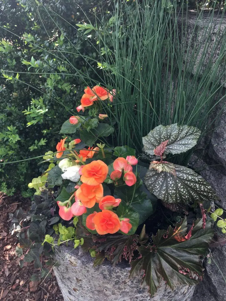 I chose two different begonias for their large, showy flowers, Hiemalis ‘Amstel Batik Orange’ and a tuberous variety, ‘Nonstop White.’ To those I added cuttings from two pass-along begonias already in my collection, an angel-wing variety and a type with large frilly leaves – official names unknown. A new, purplish creeping Jenny — Lysimachia ‘Midnight Sun’ — and the bright green Lysimachia variety that I dug out of containers I’ve had for years, spill over the rim of the pot in my new begonia garden.