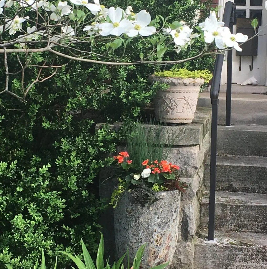 “The first thing to consider is if your planter will be in sun or shade,” Dana says. That, of course, will determine what you will put in it. A pot on a porch that receives sunshine all day will need sun- and heat-tolerant plants; a porch in dappled or full shade needs plants that don’t need as much sun to thrive. It’s important to know the conditions on your doorstep.