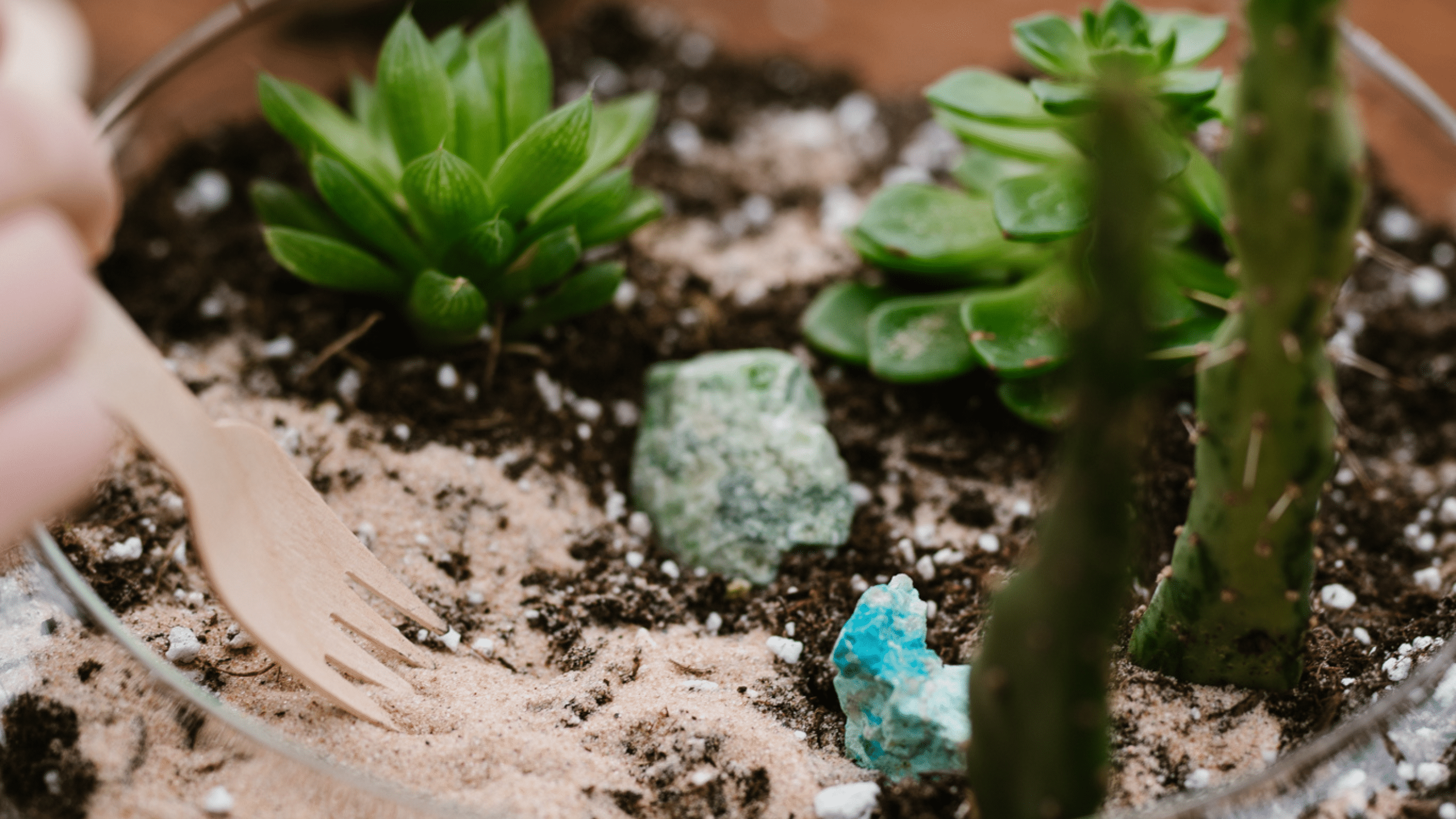 Follow up with your chosen potting soil, tailored to the type of terrarium you’re creating, whether it’s a tropical houseplant mix or a cactus mix. Each soil type offers optimum aeration, drainage, and microbial support for healthy plant roots.